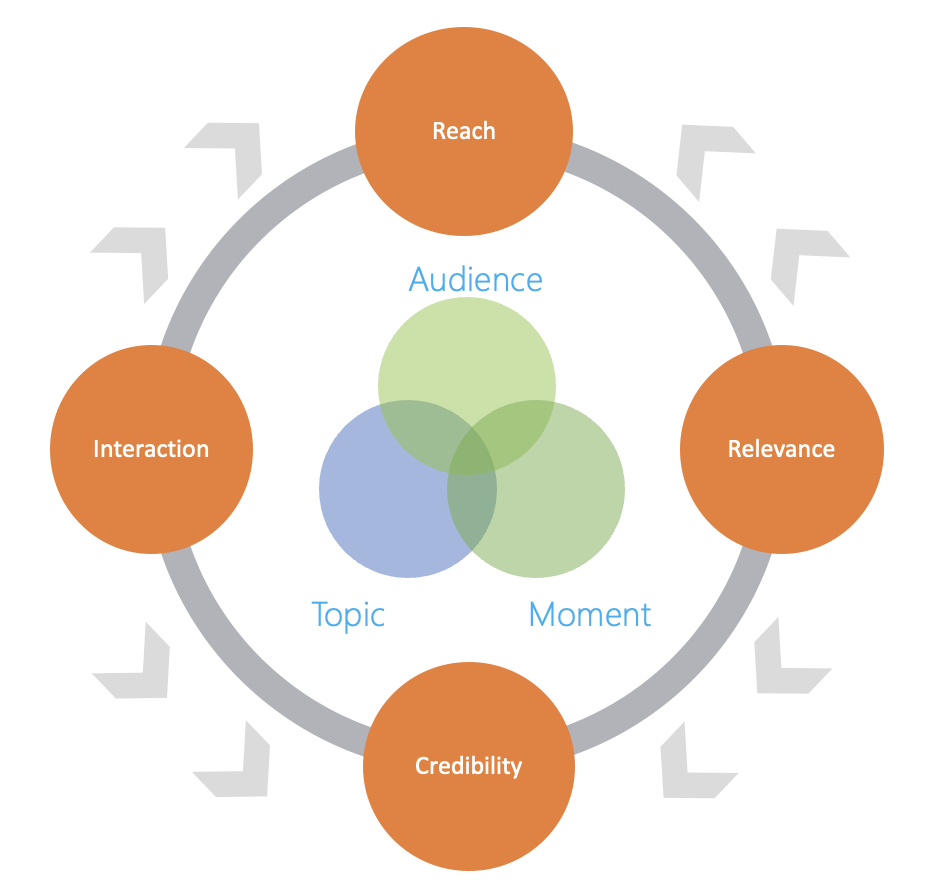Influence is not one-size-fits-all. There are many ways to be influential. Some people are reputable sources, while others have a large microphone. With this in mind, the approach uses a set of influence indicators that aims to account for the various mechanisms used by an influencer to encourage action or outcomes – namely, reach, relevance, credibility and interaction.